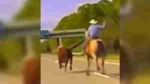 Increíble persecución en Michigan, una vaca escapa y un vaquero a caballo la persigue por la autopista