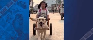 Perro se vuelve viral al llevar a su dueña a la escuela en una carreta hecha a su medida