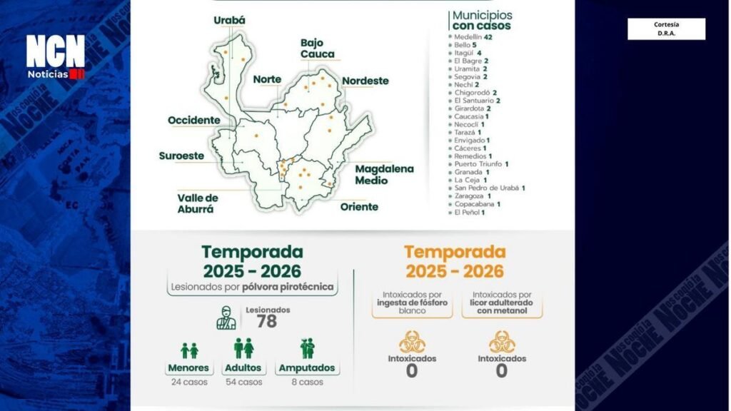 78 personas resultaron quemadas por pólvora en Antioquia durante las últimas semanas, con 42 casos confirmados en Medellín, informó la Secretaría de Salud e Inclusión Social de Antioquia junto al Instituto Nacional de Salud (INS). En las últimas 24 horas se reportaron seis nuevas víctimas, la mayoría en Medellín y una en Girardota, en plena celebración de fin de año y en medio de la campaña Soy Antipólvora promovida por la Gobernación.