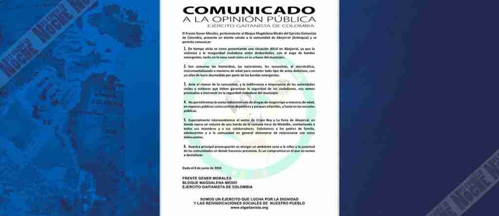 En Abejorral, Antioquia, se prendieron las alarmas, luego que se conociera un panfleto que circula en el municipio, donde el Clan del Golfo informa que actuará contra las bandas emergentes que vienen generando homicidios, extorsiones, microtráfico, instrumentalización de menores, esto con el fin de proteger a los niños y jóvenes de estas estructuras delincuenciales.