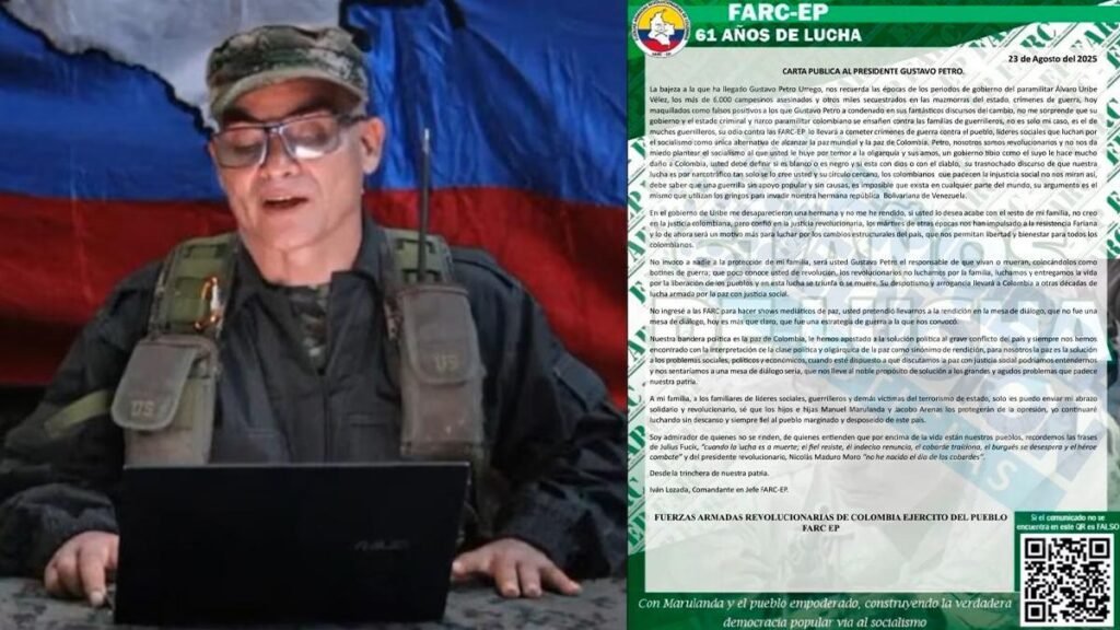 Alias ‘Iván Mordisco’, máximo jefe de las disidencias del Estado Mayor Central (EMC) de las FARC, reapareció públicamente el sábado 23 de agosto de 2025 con una carta dirigida al presidente Gustavo Petro, horas después de la captura de su hermano Luis Hernando Vera Fernández, alias ‘Mono Luis’, en la vereda Curiche, municipio de El Peñón, Cundinamarca.