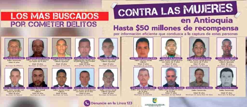 La Gobernación de Antioquia lanzó este jueves 25 de abril el primer cartel de los más buscados por feminicidios y agresiones contra mujeres en el departamento. La publicación, que tuvo lugar en el municipio de El Retiro, incluye recompensas de hasta 50 millones de pesos por información que conduzca a la captura de estos criminales.
