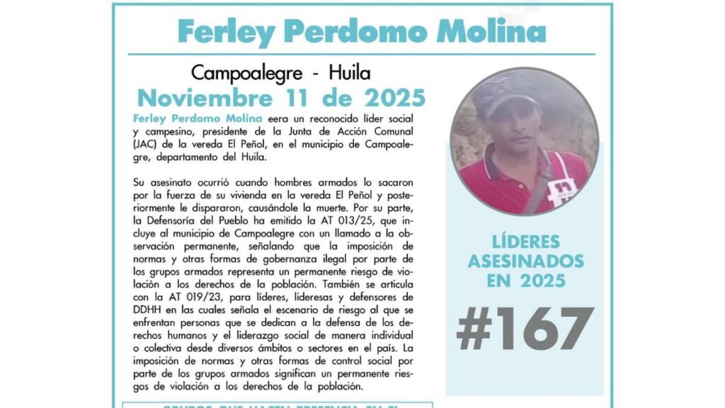 Este crimen no cae en un vacío. La Defensoría del Pueblo había alertado previamente, en la Alerta Temprana 013 de 2025, sobre la presencia amenazante de grupos armados ilegales en Campoalegre. Frente Iván Díaz, vinculado al Bloque Jorge Suárez Briceño del Estado Mayor Central, junto a bandas locales, imponen normas a la fuerza y controlan parcelas enteras del territorio rural. Es en medio de esta sombra que Ferley Perdomo dedicó sus esfuerzos comunitarios.