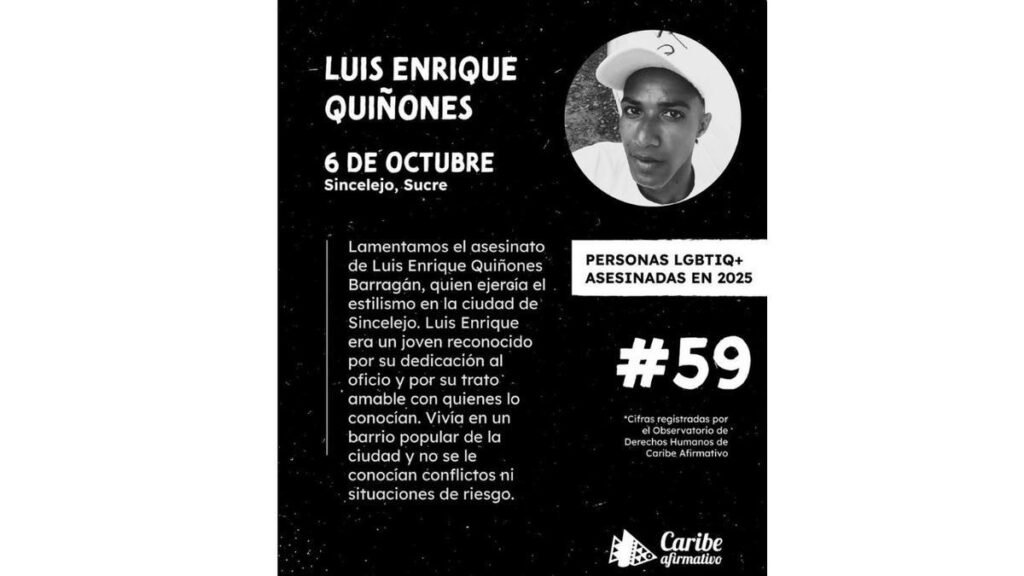 Caribe Afirmativo ha expresado su condena y tristeza ante este crimen, enfatizando la urgencia de una investigación oficial y efectiva que despliegue toda la verdad. Con este asesinato, la ya alarmante cifra de homicidios contra personas LGBTIQ+ en Colombia asciende a 59 en lo que va del año. “Nos duele profundamente la pérdida de Luis Enrique, un joven cuya voz y trabajo comunitario quedan ahora en el vacío”, afirmó la organización.