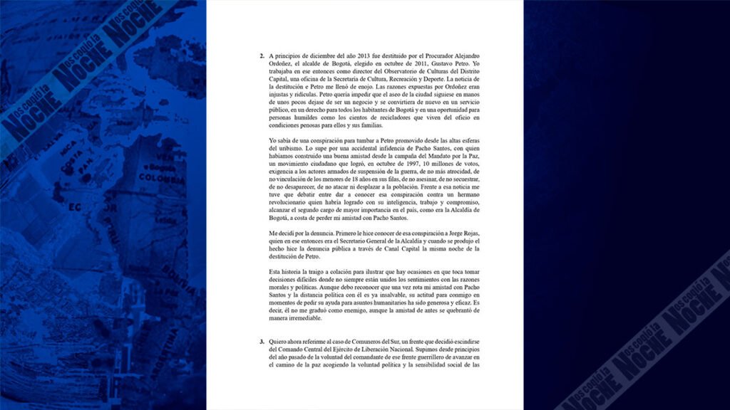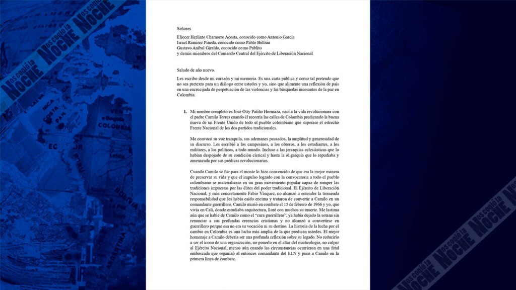 En el texto, redactado de manera personal a “Eliecer Herlinton Chamorro Acosta, conocido como Antonio García; Israel Ramírez Pineda, conocido como Pablo Beltrán; Gustavo Aníbal Giraldo, conocido como Pablito y demás miembros del Comando Central del Ejército de Liberación Nacional”; Patiño hace un recorrido por su historia con relación al ELN, hablando, entre otros, sobre el Camilo Torres, la sanción a Gustavo Petro cuando era alcalde de Bogotá y, finalmente, llegando a la situación el frente Comuneros del Sur.
