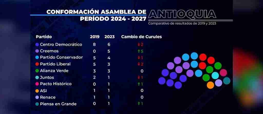 Más de 2,8 millones de antioqueños ejercieron su derecho al voto el pasado domingo, 29 de octubre, para elegir a los 25 nuevos diputados que conformarán la Asamblea departamental durante el período 2024-2027. En una jornada marcada por la participación ciudadana, el Centro Democrático y el Partido Creemos se alzaron como los principales ganadores, obteniendo un total de 11 curules.