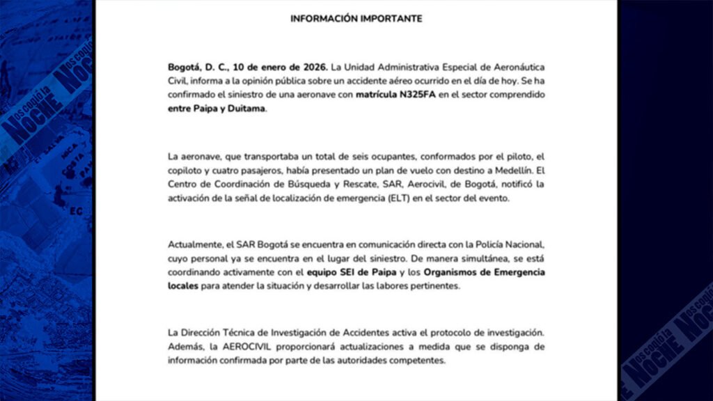El Centro de Coordinación de Búsqueda y Rescate Bogotá detectó la señal de emergencia ELT que permitió localizar rápidamente el siniestro y comenzar las labores de atención con Policía Nacional, SEI de Paipa y organismos locales. La Dirección Técnica de Investigación de Accidentes activó el protocolo correspondiente para esclarecer las causas, aunque por ahora no se ha precisado si fue un fallo técnico, error humano o las condiciones climáticas las responsables.