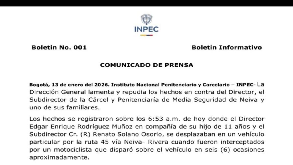 En la mañana de este martes, un ataque sicarial sobre la ruta 45 entre Neiva y Rivera cobró la vida de un menor de 11 años, hijo del director reciente de la Cárcel y Penitenciaría de Media Seguridad de Neiva, y dejó gravemente herido al subdirector de la institución.