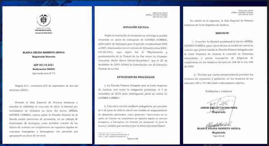 La sala especial de primera instancia de la Corte Suprema de Justicia resolvió conceder la libertad al gobernador de Antioquia Aníbal Gaviria Correa.