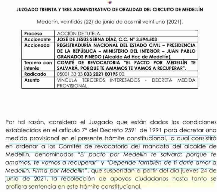 El Juzgado Treinta y Tres administrativo de Oralidad del Circuito de Medellín ha decretado una medida provisional por medio de la cual ordena la suspensión a partir de este jueves 24 de junio del proceso de recolección de firmas en el marco de la revocatoria del alcalde Daniel Quintero.