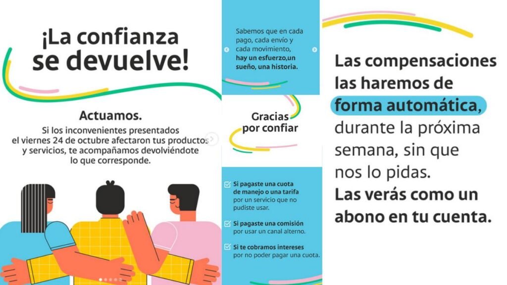 Las compensaciones incluyen devoluciones de cuotas de manejo y tarifas por servicios inaccesibles, reembolsos por comisiones de transacciones en canales alternativos como cajeros de otros bancos, además de intereses y recargos derivados de pagos atrasados durante el apagón.