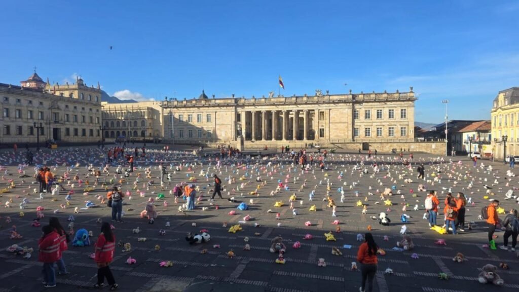 Este lunes 22 de septiembre de 2025, la Plaza de Bolívar en Bogotá se convirtió en un espacio cargado de simbolismo y protesta silenciosa. Bajo un cielo que no perdona, cientos de peluches —tantos como víctimas invisibles— fueron dispuestos a lo largo de la emblemática plaza para recordar una realidad que duele y clama por atención: la explotación sexual comercial de niñas, niños y adolescentes.