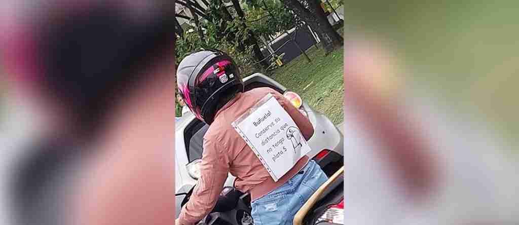 Una motociclista en Medellín se ha vuelto viral en redes sociales por su creatividad, al pegarse un aviso en la espalda, indicando que no tiene mucha experiencia conduciendo: “Buñuela!, conserve su distancia que no tengo plata”.
