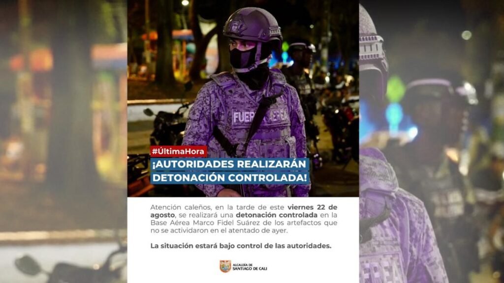 La Alcaldía de Santiago de Cali, a través de la red social X, confirmó que este jueves se realizará la detonación controlada de los artefactos explosivos que no alcanzaron a estallar durante el atentado del pasado 21 de agosto. El procedimiento se llevará a cabo en la Base Aérea Marco Fidel Suárez bajo estrictas medidas de seguridad y con acompañamiento de las autoridades, quienes aseguraron que la situación estará bajo control.