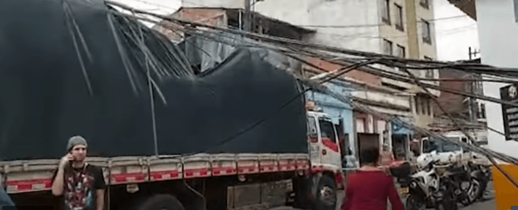 En el barrio San Nicolás de Cali, un vehículo tipo camión se enredó con el cableado eléctrico de señales parabólicas, derribando cinco postes de luz; el incidente ocasionó afectaciones a viviendas, vehículos, daños a electrodomésticos, pérdidas en insumos de empresas, y un apagón durante varias horas.