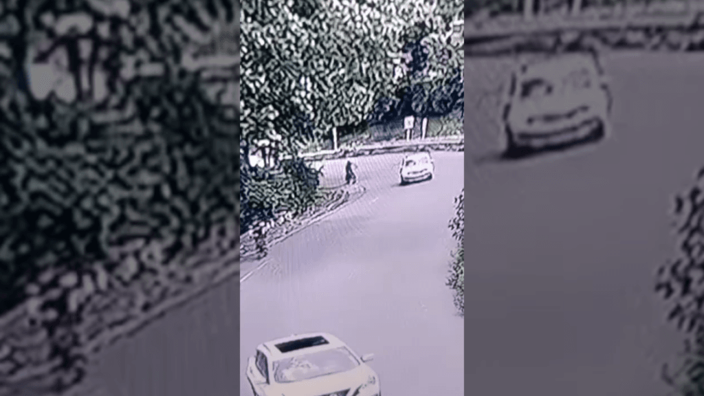 A través de un video de seguridad, se observa cómo un delincuente saca provecho del ritmo que lleva un ciclista mientras va en ascenso para empujarlo y robarle la bicicleta.