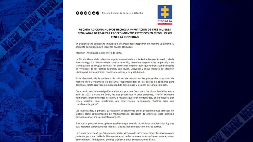 En las últimas horas, la Fiscalía General de la Nación imputó nuevos cargos a Jackeline Bedoya Acevedo, María Paola Arango Garrillo y Michel Chaverra Jaramillo por realizar cirugías estéticas ilegales en Medellín, que dejaron al menos 55 víctimas, de las cuales más de 40 sufren secuelas graves. Las presuntas responsables aceptaron su participación en delitos como concierto para delinquir, estafa agravada y lesiones personales dolosas.