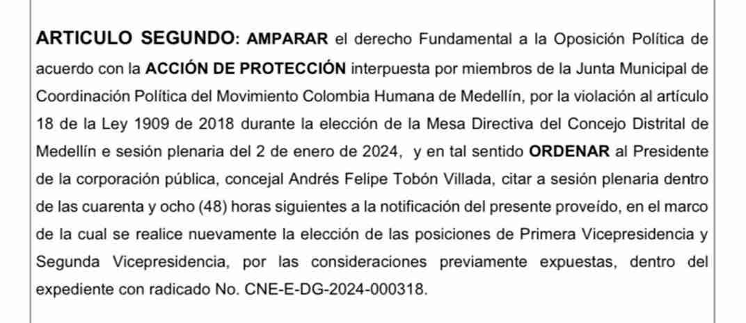 “Este documento nos da la razón en la batalla jurídica que hemos dado a favor nuestro y de la ciudadanía de Medellín. Dice que se violaron los derechos de la oposición política en Medellín al no estar representada en la mesa directiva del Concejo, la cual está compuesta por tres personas que apoyan al alcalde de Medellín. Esta resolución obliga al presidente del Concejo a repetir las elecciones de primera y segunda vicepresidencia para garantizar la presencia de la oposición,” declaró el concejal José Luis Marín Mora.