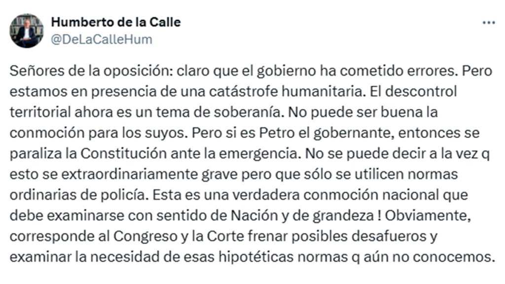 El senador Humberto de la Calle, defendió el anuncio del presidente Gustavo Petro Urrego, de declarar el estado de conmoción interior, argumentando que lo que está sucediendo en el Norte del país, no es solamente una crisis humanitaria, sino que es algo extraordinario que merece medidas igualmente extraordinarias.