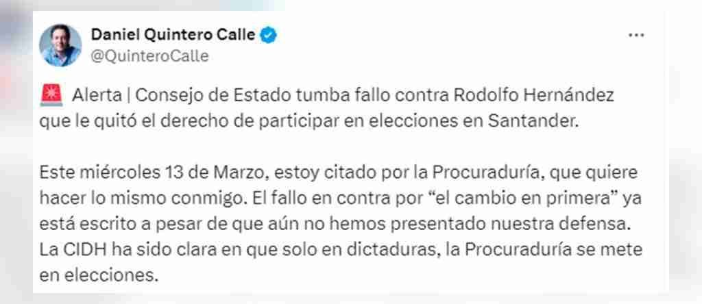 “Este miércoles 13 de marzo, estoy citado por la Procuraduría, que quiere hacer lo mismo conmigo. El fallo en contra por “el cambio en primera” ya está escrito a pesar de que aún no hemos presentado nuestra defensa. La CIDH ha sido clara en que solo en dictaduras, la Procuraduría se mete en elecciones.” Escribió Quintero Calle.
