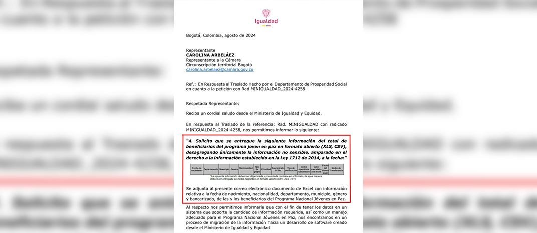 En su denuncia, la congresista anexa un documento, que, según afirma, fue el enviado por el ministerio de la Equidad y la Igualdad, ante el derecho de petición a ellos realizado, para tener acceso a la información de las transferencias realizadas y en donde halló, finalmente, las inconsistencias en las edades de los beneficiados.