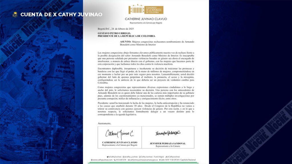 La carta, firmada por las representantes Catherine Juvinao, Jennifer Pedraza, Julia Miranda, Carolina Giraldo, Katherine Miranda, Marelen Castillo y la vicepresidenta segunda de la corporación, Lina María Garrido, agrega que una personas, con los cuestionamientos de Benedetti no debería liderar una cartera tan importante y llama la atención sobre la traición de la que se sienten víctimas.