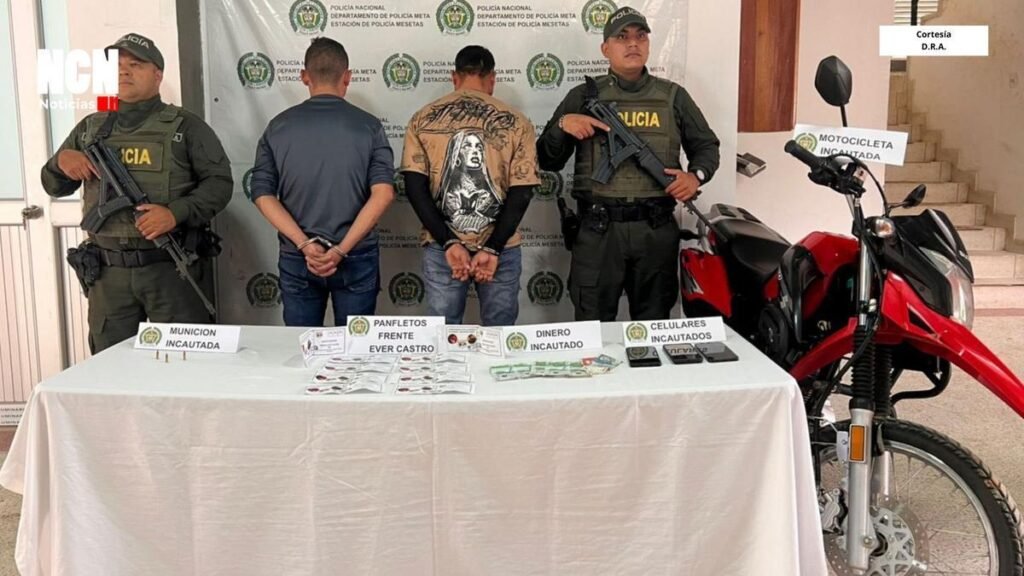 La Policía Nacional puso a disposición de la Fiscalía General de la Nación a dos personas capturadas en flagrancia en Mesetas, Meta, porque portaban munición, panfletos con mensajes intimidatorios y otros elementos probatorios relacionados con actividades extorsivas atribuidas a disidencias de las FARC.