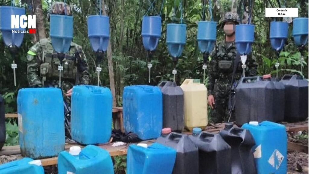 En las últimas horas, la Brigada de Selva No. 27 del Ejército Nacional y la Policía Nacional destruyeron un laboratorio clandestino dedicado al procesamiento de permanganato de potasio en la zona rural de Valle del Guamuez, Putumayo, afectando a estructuras criminales relacionadas con el narcotráfico.