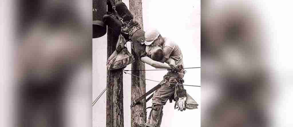 En esta conmovedora fotografía, se observa a dos trabajadores eléctricos, Champion Randall y JD Thompson, en la cima de un poste de electricidad, que realizaban una rutina de mantenimiento cuando un inesperado incidente cambió sus vidas para siempre. Champion, accidentalmente, tocó una línea de baja tensión en la parte superior del poste, y más de 4.000 voltios recorrieron su cuerpo, deteniendo su corazón al instante. Para poner esto en perspectiva, una silla eléctrica utiliza alrededor de 2.000 voltios.