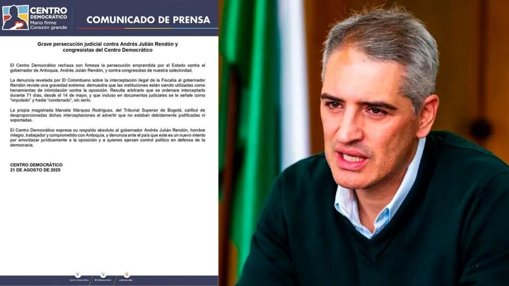 En las últimas horas, el Centro Democrático denunció un caso de persecución política tras confirmarse la interceptación de las comunicaciones del gobernador de Antioquia, Andrés Julián Rendón, durante 71 días por parte de la Fiscalía General de la Nación. Estos hechos están relacionados con una investigación por presuntas irregularidades en contratos de su gestión como alcalde de Rionegro.