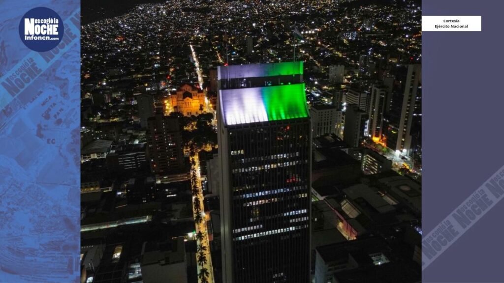 En la noche del jueves 28 de agosto, el emblemático edificio Coltejer, en Medellín, se iluminó con los colores de la bandera de Antioquia, como homenaje a los 13 policías asesinados en la vereda Los Toros, municipio de Amalfi, el pasado 21 de agosto. La actividad fue parte de la conmemoración organizada por la Gobernación de Antioquia, que declaró día de duelo en todo el departamento.