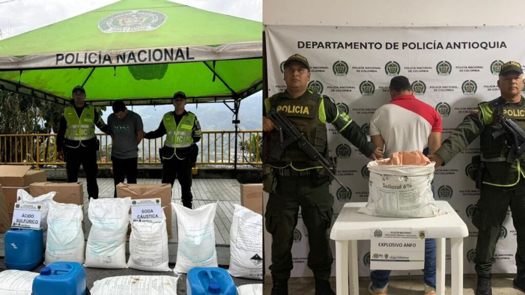 En dos operativos realizados en las vías de Antioquia, la Policía Nacional capturó a dos hombres que transportaban químicos peligrosos, unos usados para procesar alucinógenos y otros para fabricar explosivos.