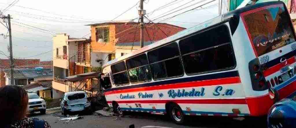 El descenso desbocado de este vehículo por la empinada vía solo fue detenido por un carro que estaba parqueado en esta zona, evitando así que el bus siguiera su peligroso descenso por este barrio de Bello.