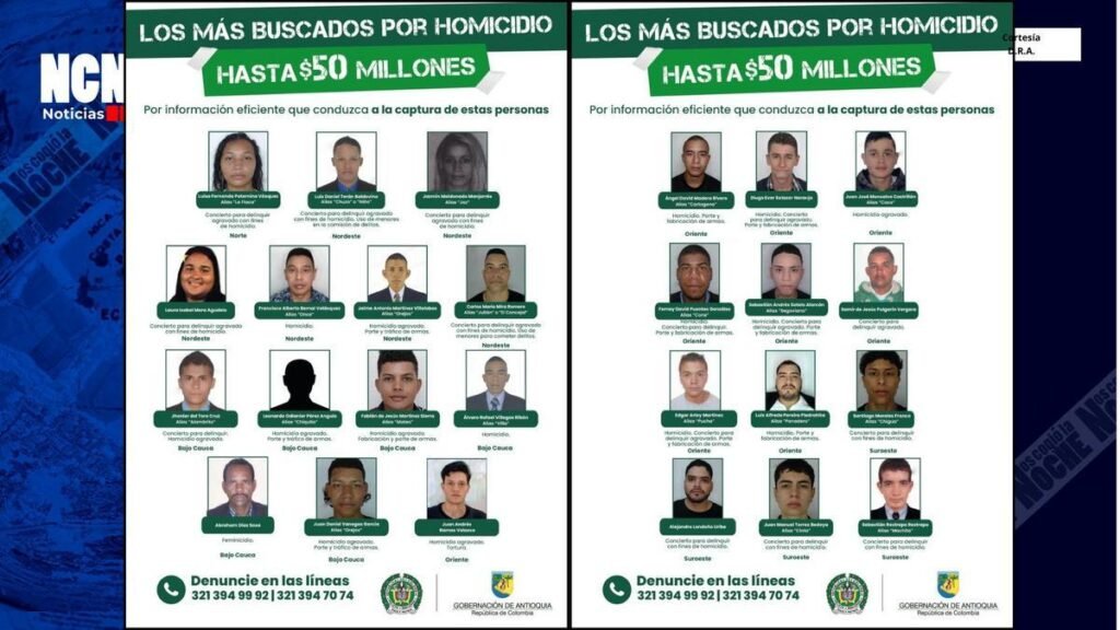 En las últimas horas, la Gobernación de Antioquia, junto con la Policía Nacional, presentó un cartel con 27 personas señaladas por homicidio agravado y otros delitos, relacionados principalmente con el Clan del Golfo. La estrategia busca la colaboración ciudadana para facilitar capturas mediante recompensas de hasta 50 millones de pesos.