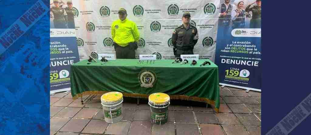 “En el procedimiento fueron incautados los siguientes elementos, de acuerdo al Artículo 365 del Código Penal, así: 02 revólver calibre 38, 02 revólver calibre 32, 02 pistolas calibre 7.65, 17 unidades de munición (cartuchos cal 32mm, 38mm y 7,65mm) y 02 proveedores para pistola calibre 7.65; por un avalúo según lista de precios de Indumil Colombia de $40.242.481 de pesos”: Policía Nacional.