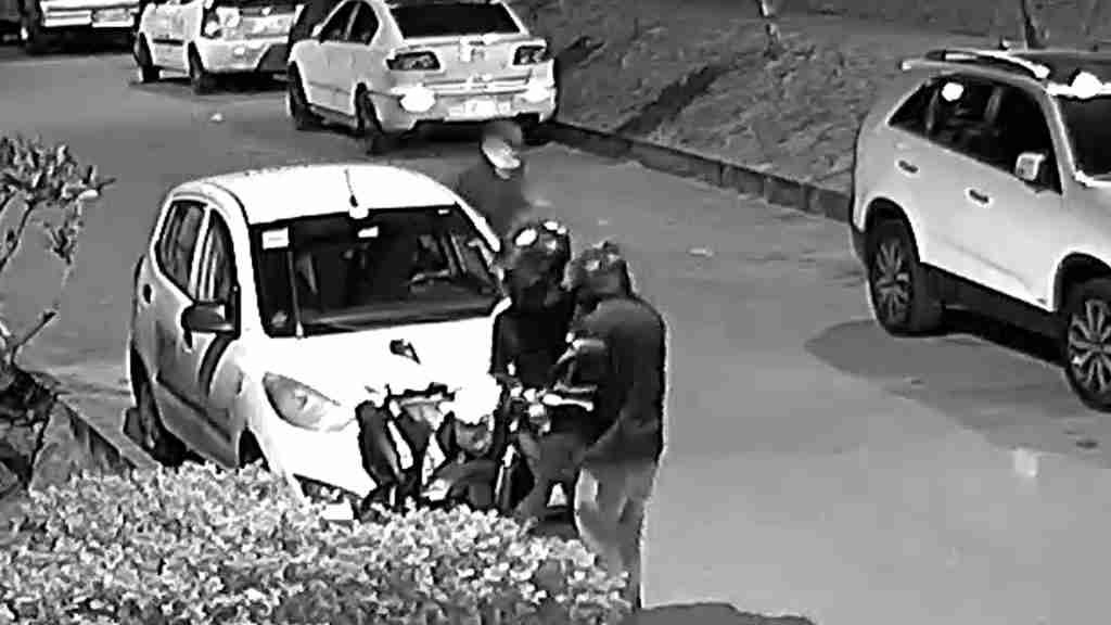El primer delincuente se le acerca y lo intimida, mientras que el segundo se le abalanza y lo tira al suelo; la víctima es sometida hasta que el primero logra encender el vehículo y emprenden la huida.