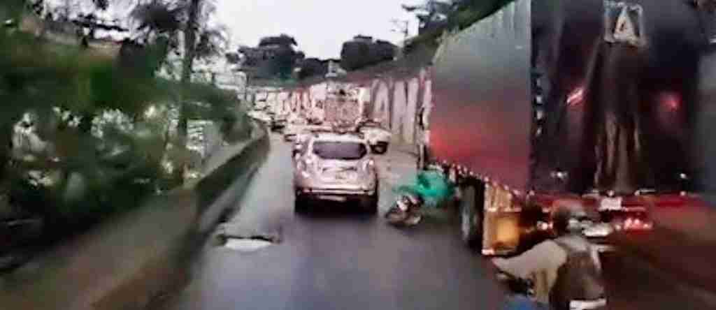 En una imprudencia que cometen los conductores de motos frecuentemente y que ha generado muchos accidentes, este jueves 20 de junio una persona perdió la vida. La maniobra como se puede ver en el producto audiovisual es adelantar por la mitad a dos vehículos, entre ellos, uno de carga, donde el motociclista fácilmente pierde el control y termina bajo las llantas del pesado camión, tal y como ocurrió en este accidente, adicionalmente el agravante en el hecho de hoy es que el pavimento estaba mojado, lo que le dificulta al conductor del vehículo de dos ruedas estabilizarse de nuevo.