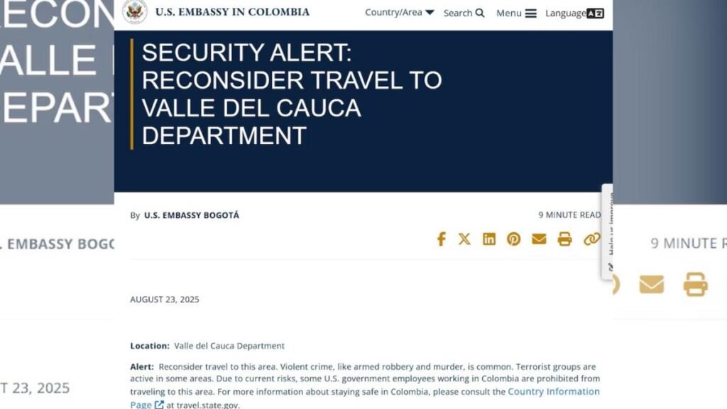 Este sábado 23 de agosto de 2025, la embajada de Estados Unidos en Bogotá encendió las alarmas para sus ciudadanos: “reconsideren sus viajes” al Valle del Cauca, epicentro de un reciente y alarmante deterioro en la seguridad. La advertencia llega justo después del atentado con camión bomba que sacudió Cali el jueves 21, dejando seis muertos y más de setenta heridos.