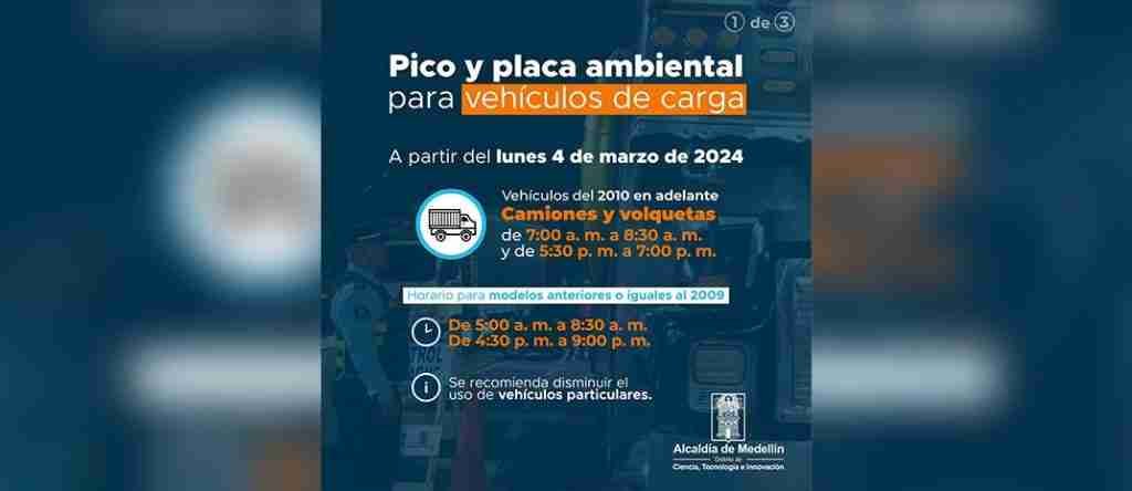 “Mediante el Decreto 102 de 2024 y modificación del Decreto 104 de 2024, se toman medidas, entre ellas, implementar de lunes a viernes, para los vehículos de servicio público y privado de transporte de carga, incluyendo volquetas», dijo en un comunicado la Alcaldía de Medellín.