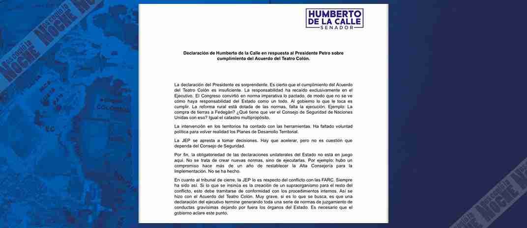 El senador de la República y negociador del proceso de paz con las extintas FARC, Humberto de la Calle, le respondió al presidente Gustavo Petro, su propuesta de presentarse ante la Organización de Naciones Unidas (ONU) y asegurar que el Estado no está cumpliendo con sus compromisos.