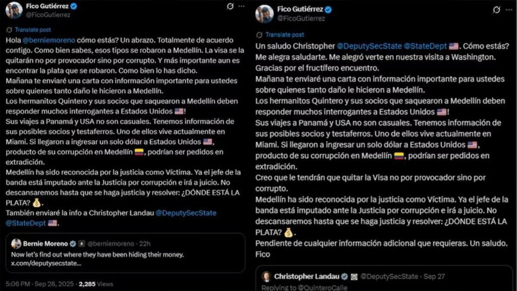 “Esos tipos se robaron a Medellín. La visa se la quitarán no por provocador, sino por corrupto. Y más importante aún es encontrar la plata que se robaron”, señaló el alcalde en su cuenta oficial de X (antes Twitter), en respaldo al senador Moreno, quien afirmó: “Ahora vamos a averiguar dónde han estado escondiendo su dinero”.