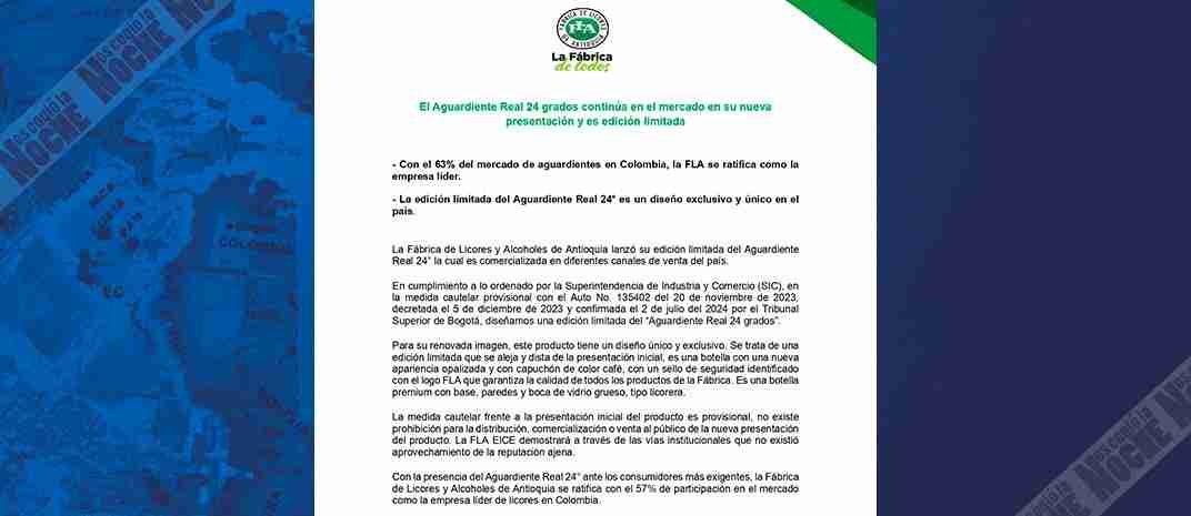 En el comunicado del fallo, se especificó: «La Sala Civil del Tribunal Superior de Bogotá ratificó la medida cautelar decretada en diciembre de 2023, por la Superintendencia de Industria y Comercio, que no solo ordenaba retirar inmediatamente del mercado colombiano los productos identificados como Aguardiente Real de color amarillo, sino también abstenerse de comercializarlo, promocionarlo y publicitarlo». En respuesta, la FLA ha rediseñado la imagen del licor para cumplir con la orden de la Superintendencia de Industria y Comercio.