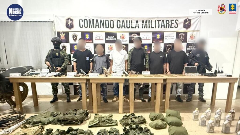 El procedimiento policial permitió allanar tres viviendas en la vereda Guadualito, donde se incautó un gran arsenal: pistolas, una subametralladora, más de 700 cartuchos, motocicletas, radios, celulares, chalecos multipropósito, una antena repetidora y sustancias químicas como ácido sulfúrico, que serían utilizadas para cometer delitos. Entre los capturados está Israel Gómez Holguín, vinculado además a desaparición forzada, extorsión y tráfico de armas.