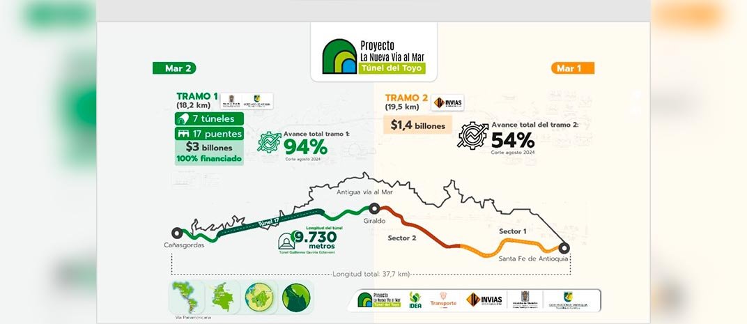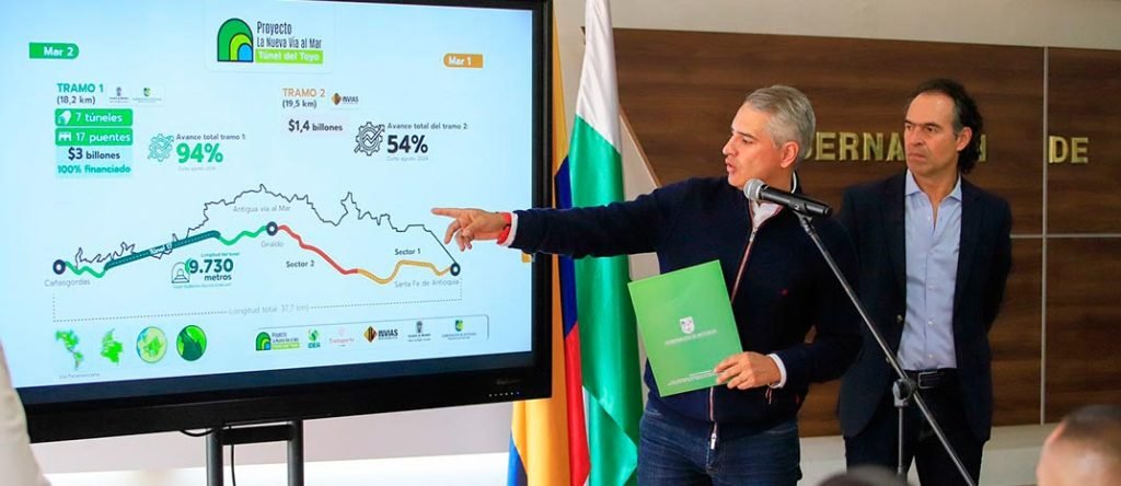 El gobernador de Antioquia, Andrés Julián Rendón, y el alcalde del Distrito de Medellín, Federico Gutiérrez Zuluaga, anunciaron una alianza para financiar el sector 1 del tramo 2 de la Vía al Mar – Túnel del Toyo, un proyecto vital para la infraestructura regional. El tramo, que abarca 4.2 kilómetros, fue cedido al Departamento de Antioquia por el Gobierno Nacional, y se espera que la ejecución de las obras tome dos años, una vez se aseguren los recursos.