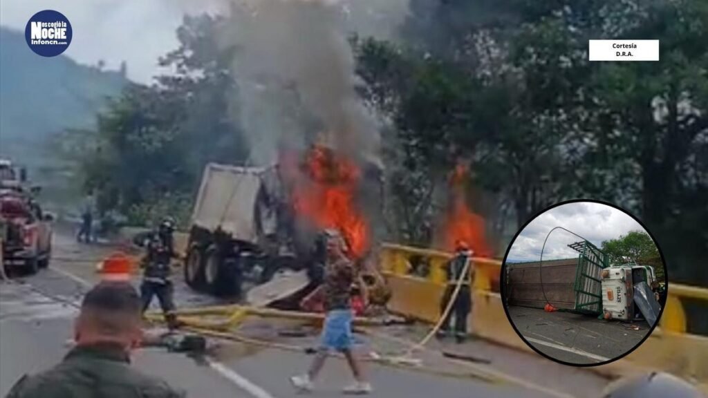 El choque ocurrió cerca de las 11:00 a.m., cuando una volqueta perdió el control en el descenso hacia Calarcá y colisionó contra un vehículo estacionado y otro en movimiento. La colisión multiplicó el daño: dos vehículos quedaron envueltos en llamas y uno más volcó, situación que obligó a restringir la movilidad por varias horas mientras se realizaban las labores de atención y limpieza. Los bomberos actuaron rápidamente para apagar el incendio y evitar un riesgo mayor.