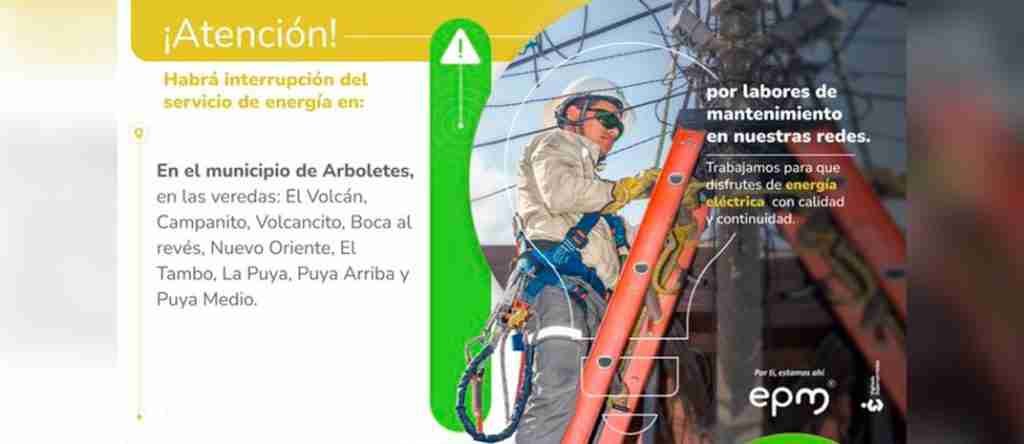 Empresas Públicas de Medellín (EPM) informó que este sábado 24 de febrero, se adelantarán labores de mantenimiento en su infraestructura eléctrica, por lo que será necesario interrumpir la prestación del servicio de energía, de manera programada, en sectores del municipio de Arboletes.