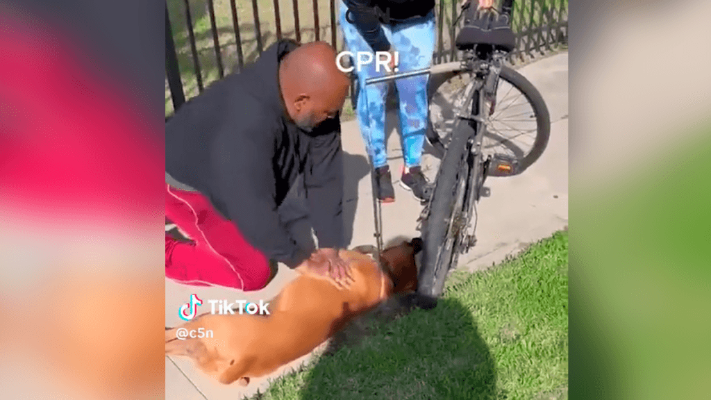 Según los informes, el perro se desmayó al intentar igualar la velocidad de la bicicleta de su dueña, afortunadamente, un hombre llamado Jay, quien pasaba por la misma área, pudo brindarle ayuda al perro gracias a sus conocimientos en primeros auxilios.
