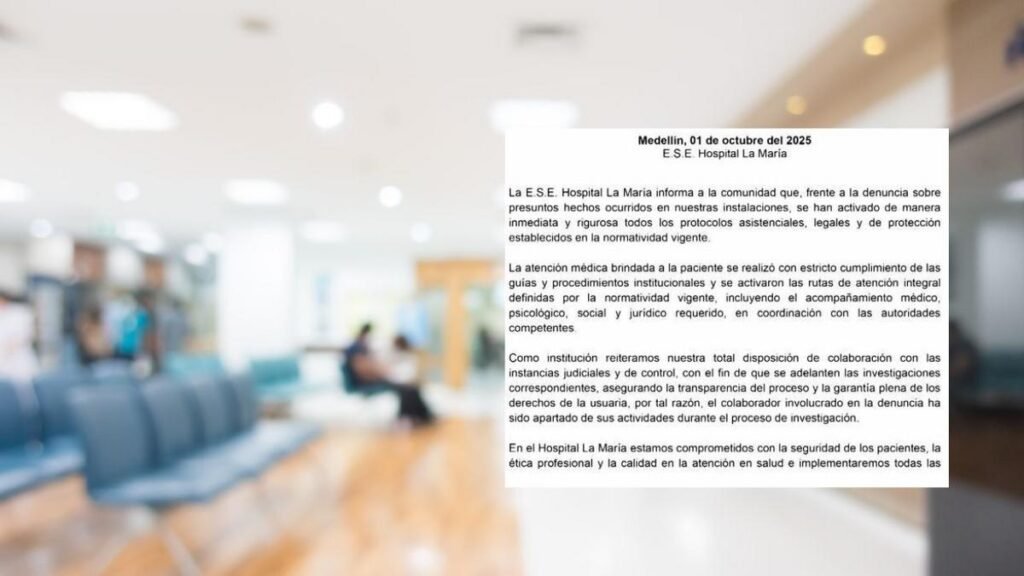 Este lunes 29 de septiembre de 2025, el Hospital La María, en el noroccidente de Medellín, quedó envuelto en una sombra inquietante: un camillero fue retirado de manera inmediata tras ser señalado por una joven paciente de 26 años por presunto abuso sexual.