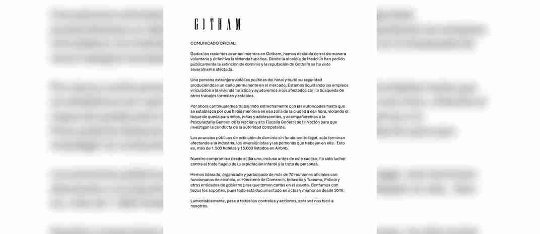 El hotel Gotham, ubicado en El Poblado, conocido en la última semana por el escándalo de presuntos hechos de explotación sexual a menores de edad, anunció el cierre definitivo y voluntario del establecimiento como vivienda turística.