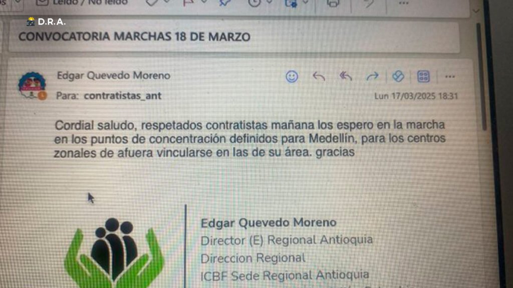 Un polémico correo se ha dado a conocer, en el que se evidencia que el director encargado regional del Instituto Colombiano de Bienestar Familiar (ICBF), Edgar Quevedo Moreno, en la que, avisa a sus contratistas que los espera para las marchas en los diferentes puntos de concentración en Medellín.
